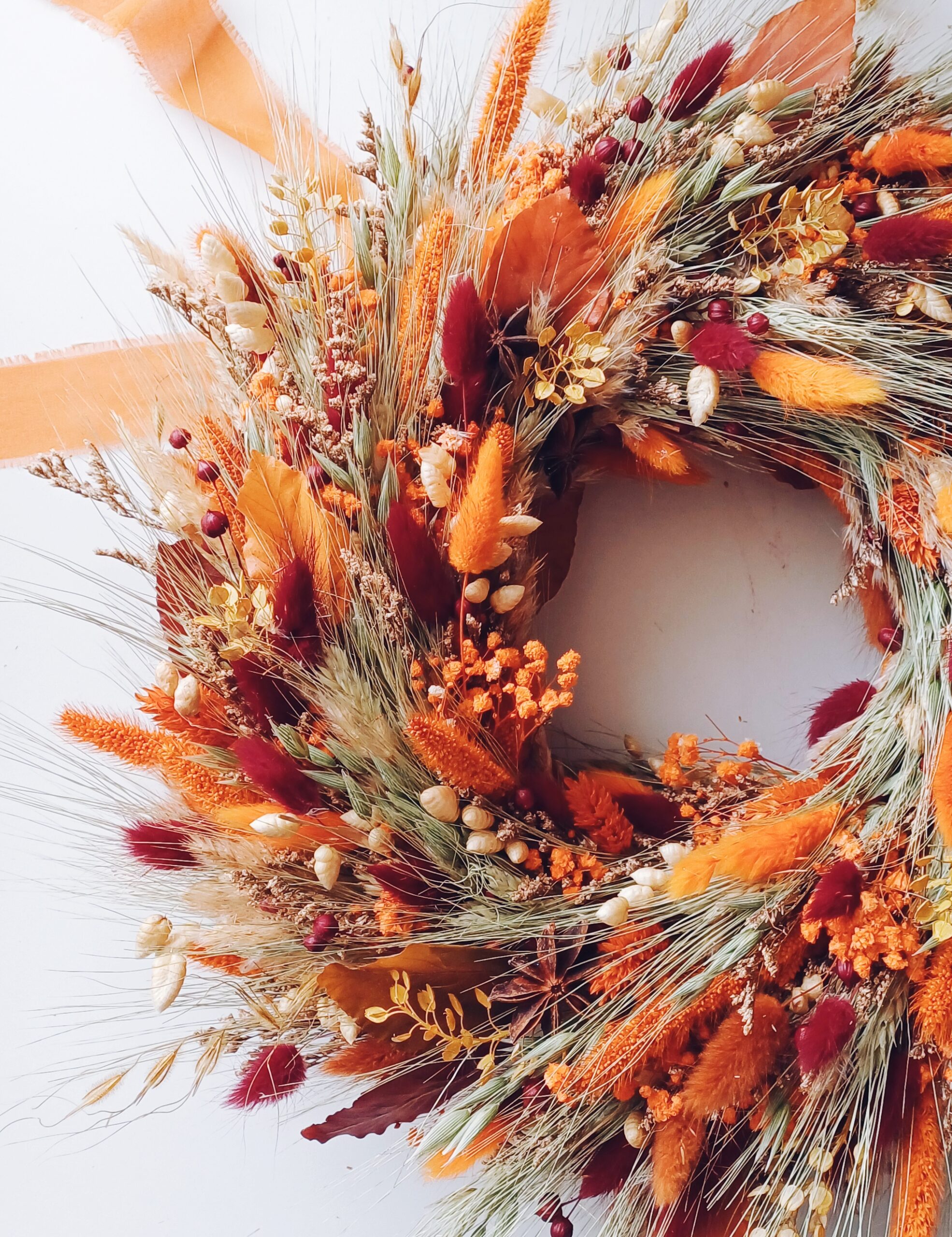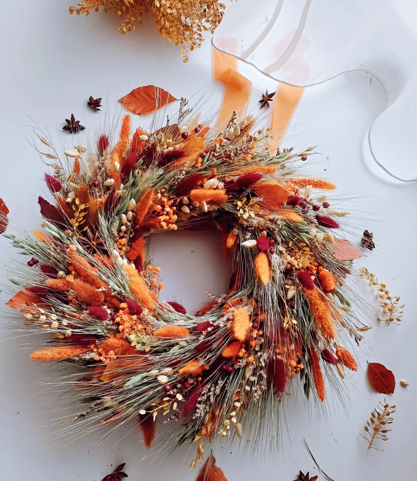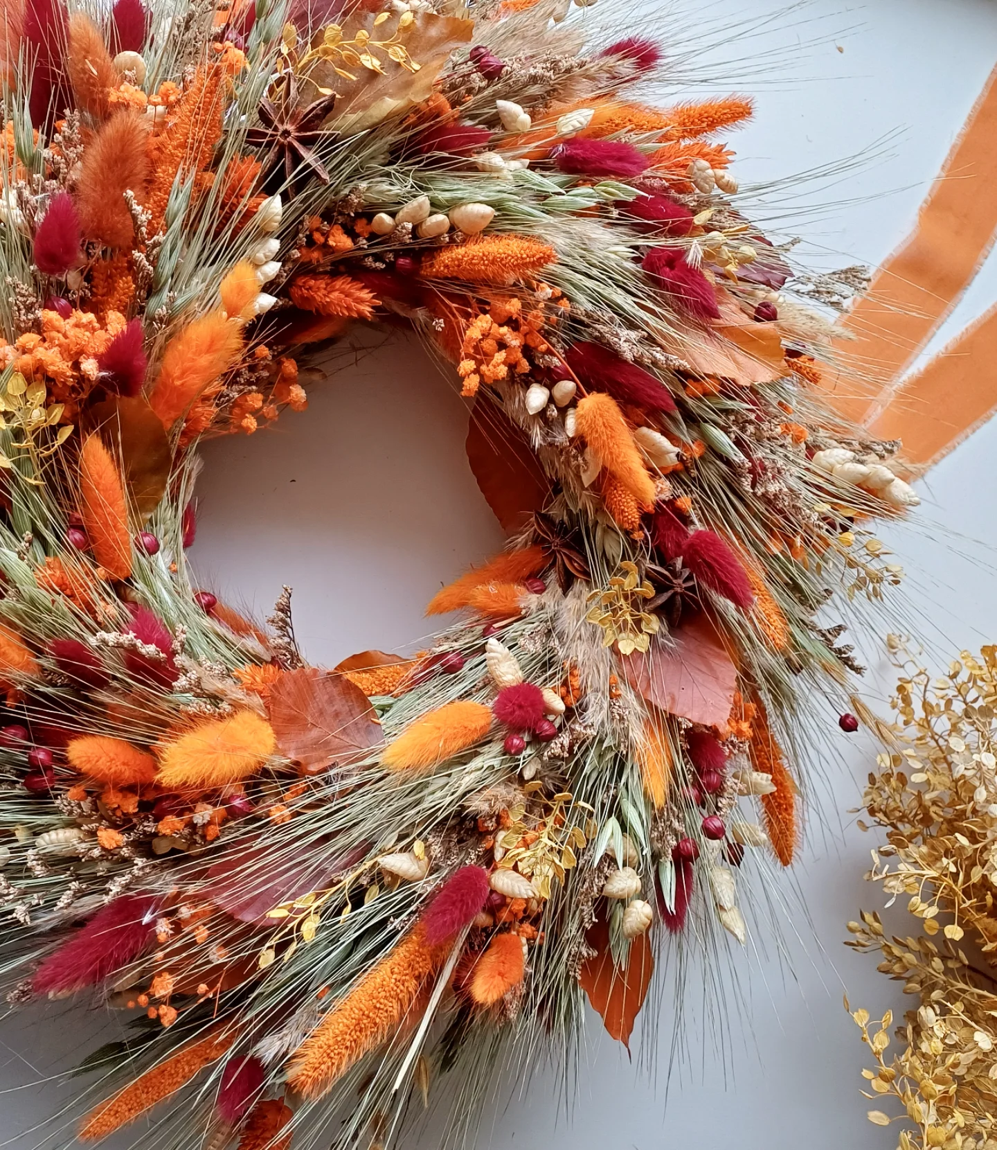 Őszzel a fények lágyabbak, a színek mélyebbek – piros, narancs és arany ragyogja be a napokat. Ez a koszorú is ezt az érzést hordozza: melegség, otthonosság, egy kis kuckózás a színek ölelésében.