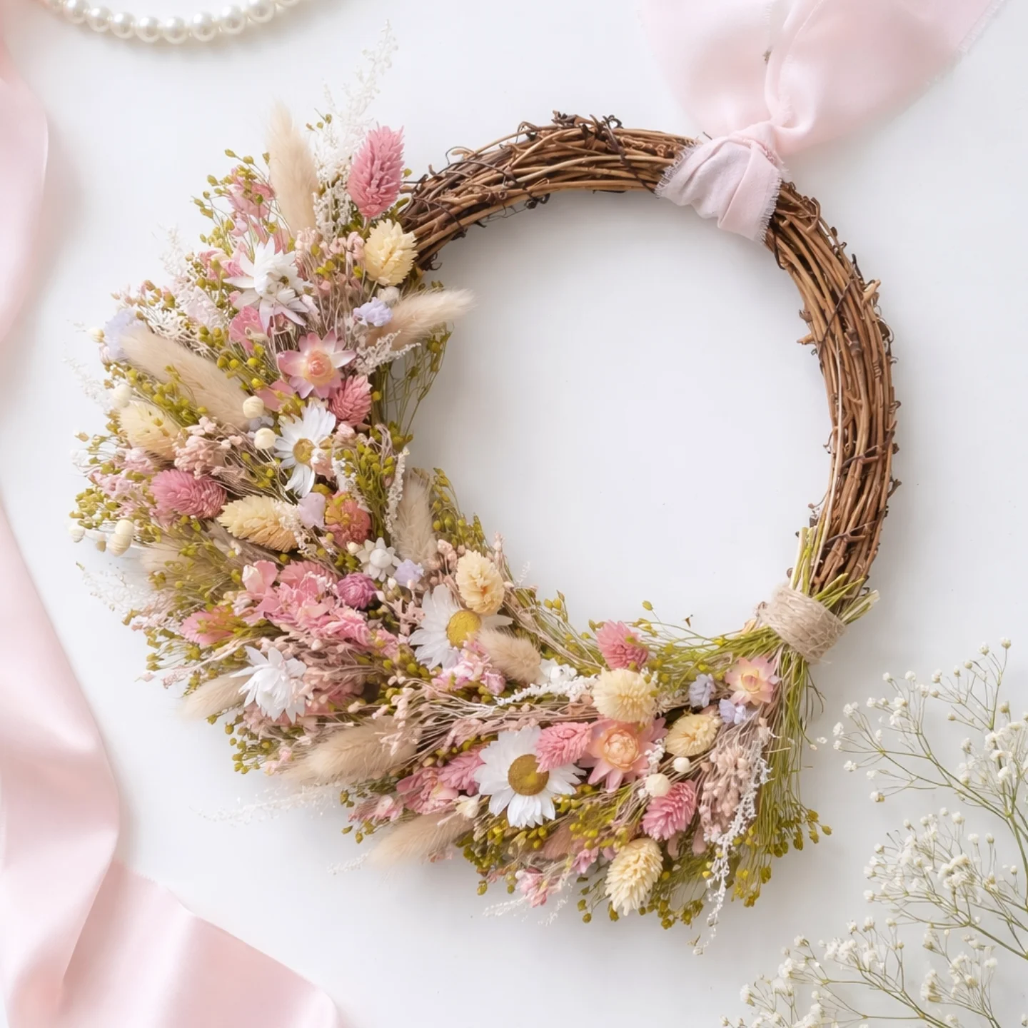 Igazi tavaszi színvilágú koszorú krém, fehér, zöld és rózsaszín virágokkal díszítve.