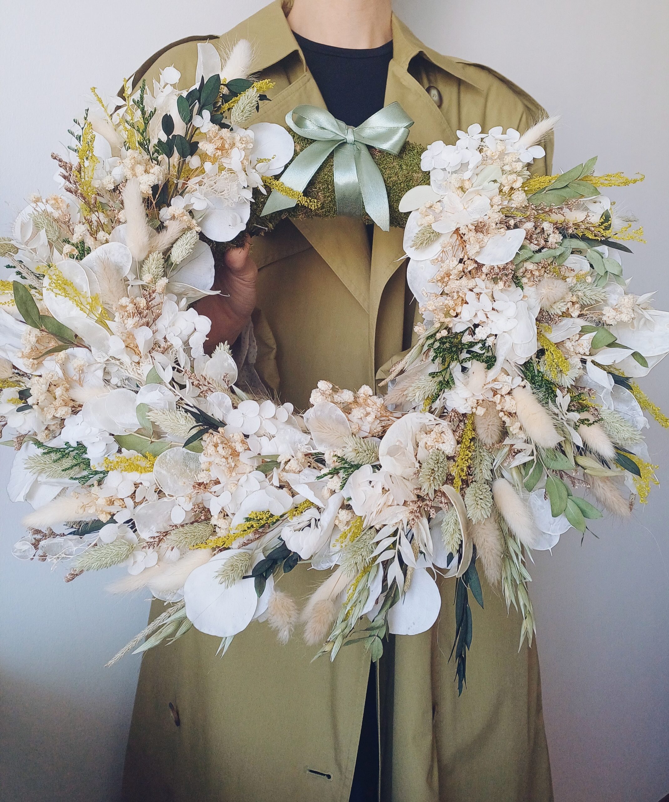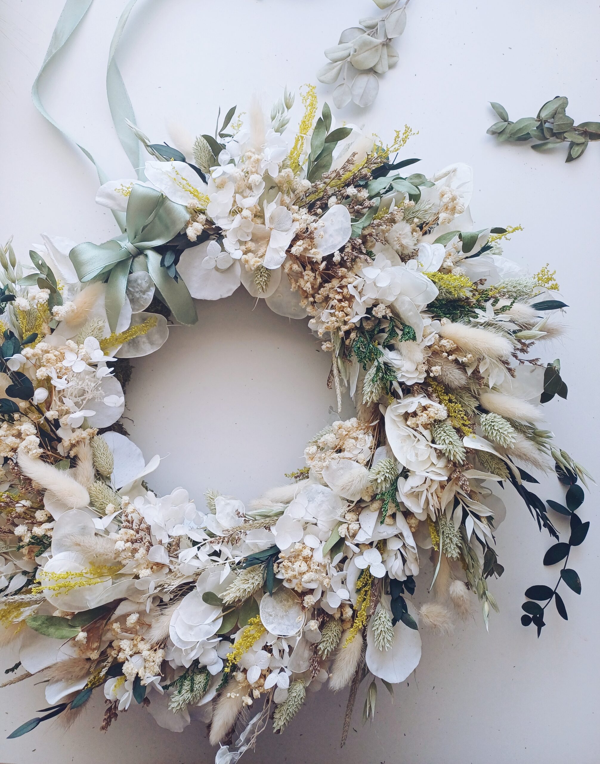 Lunariával, eukaliptusszal és ruscusszal díszített kopogtató olyan natúr virágokkal kiegészítve, mint a zab, fénymag és lagurus.