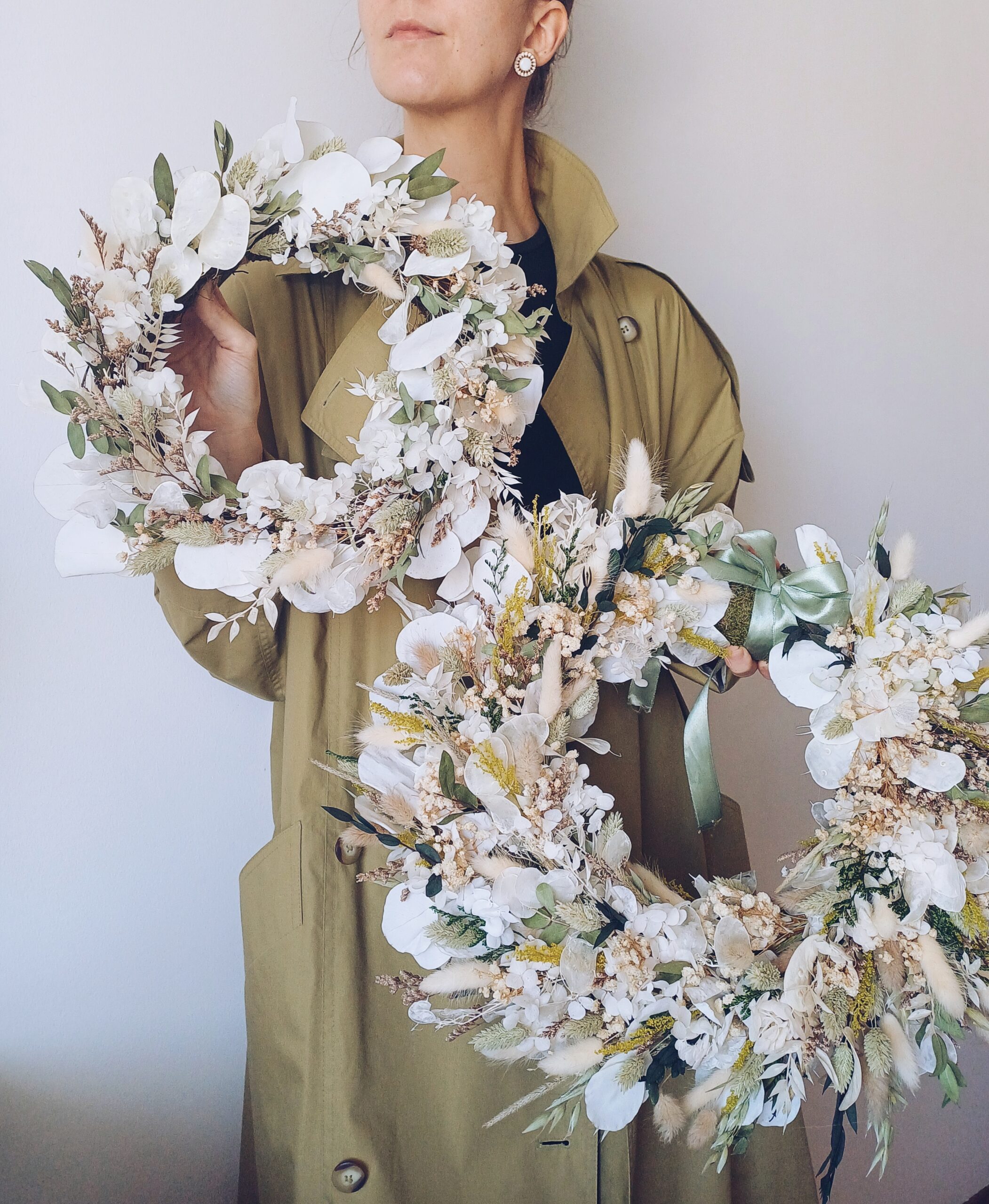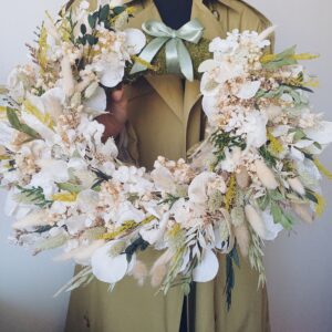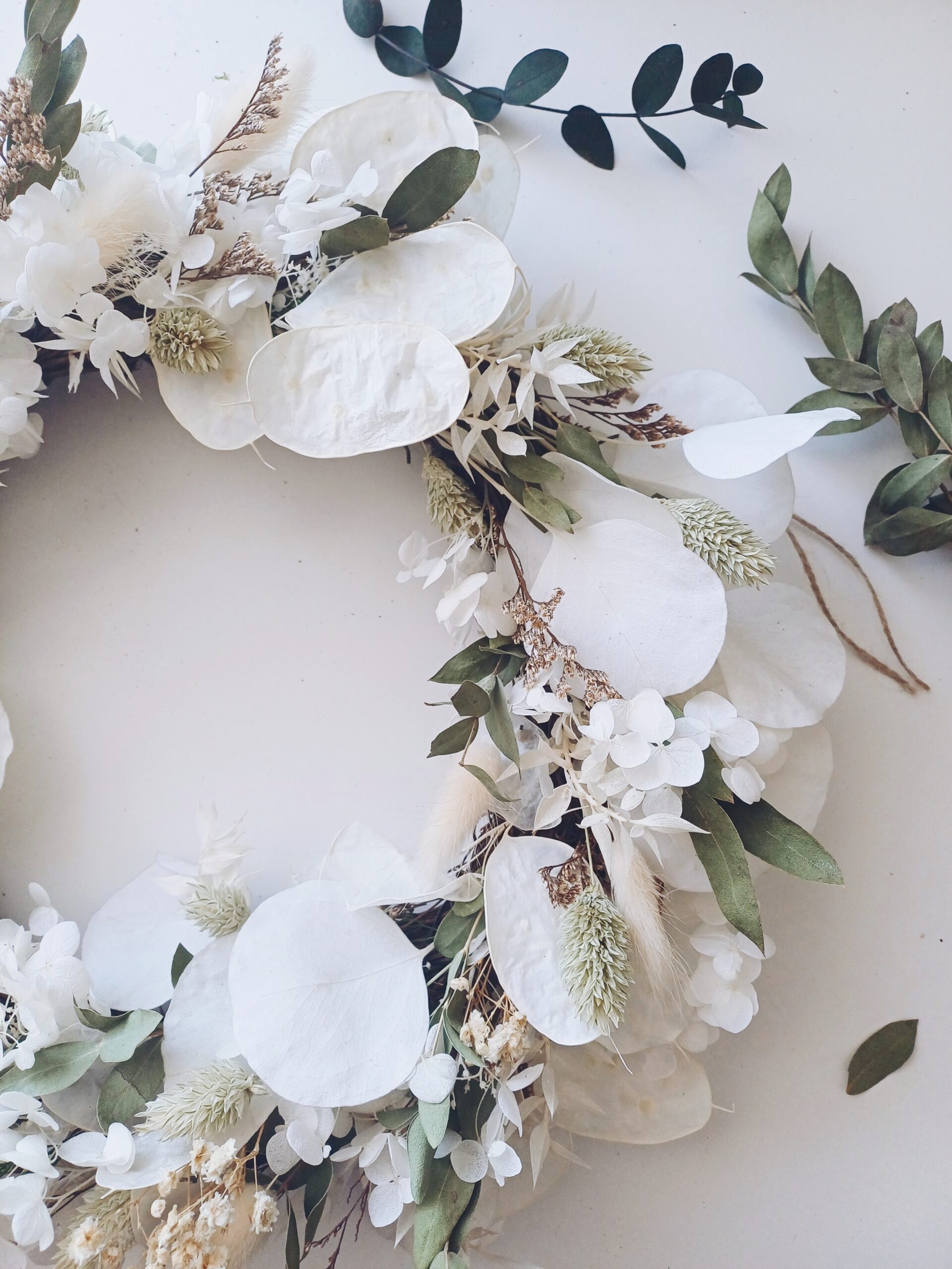 Vesszőalapra készült, lunariával, eukaliptusszal és ruscusszal díszített koszorú az elegancia és letisztult szépség jegyében.