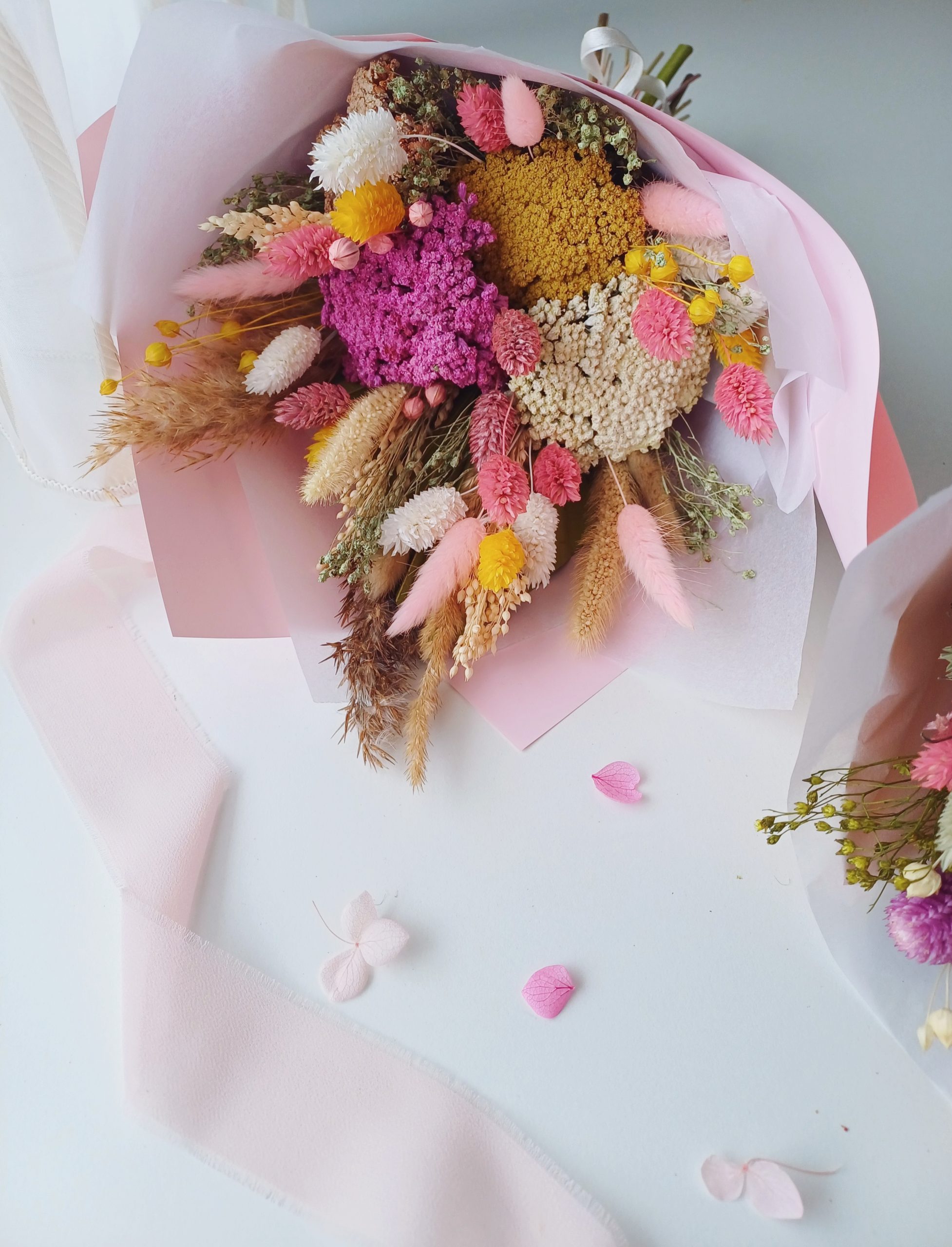 Vibráló sárga és pink színű csokor krém és zöldes árnyalatokkal kiegészülve.